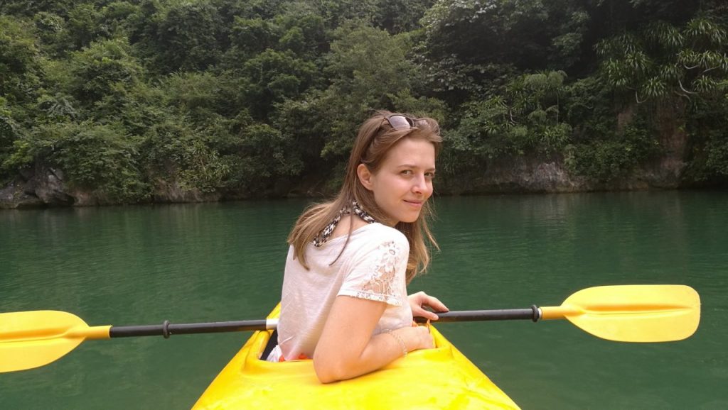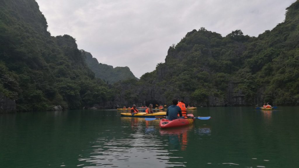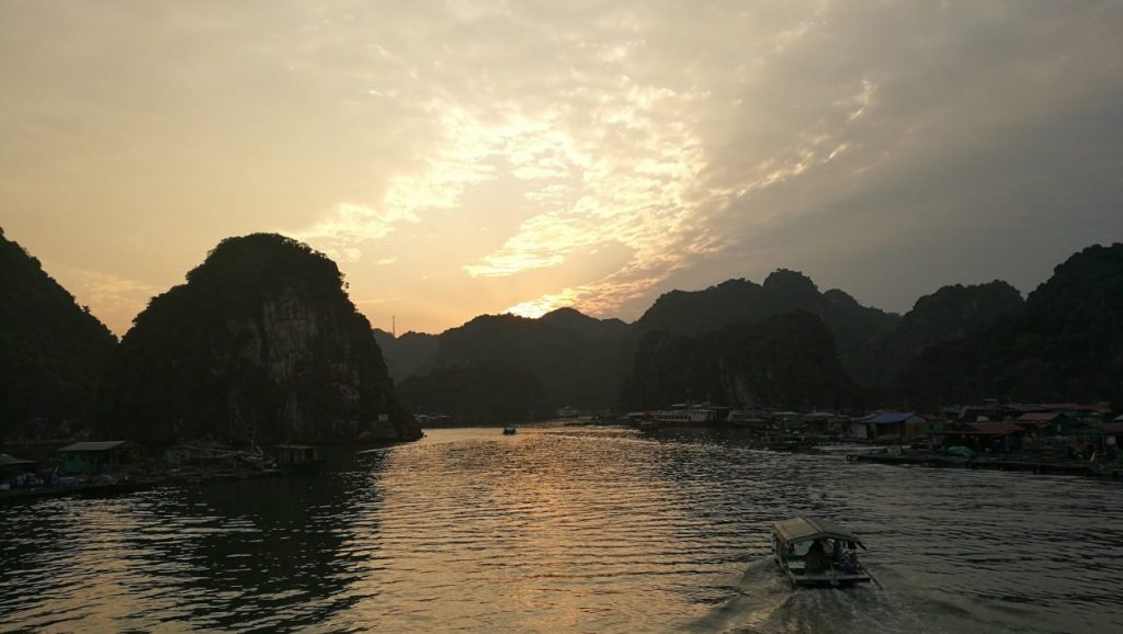 Der Besuch der Halong Bucht am nächsten Tag erfogt über eine ganztägige Schiffstour inklusive Kajak fahren und Fischerdorf besuchen. Und natürlich von der Reling ins Wasser springen!;-) Viele Nationen sind auf dem Schiff vertreten. Viel Spaß haben wir mit ein paar Amerikanern, die sich auch ein laar Bier (hier: Bia) gegönnt haben:-D