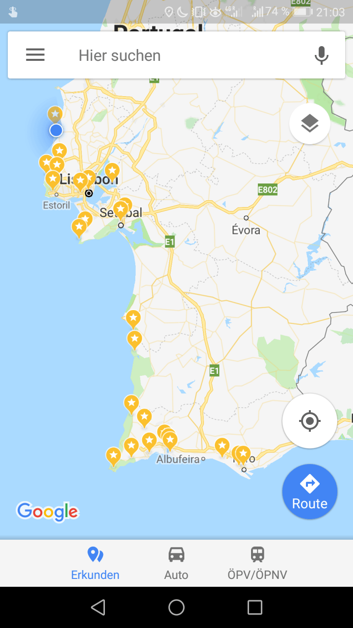 Hier noch eine Karte mit den Orten wo wir bisher waren und der blaue Punkt als aktueller Standort.