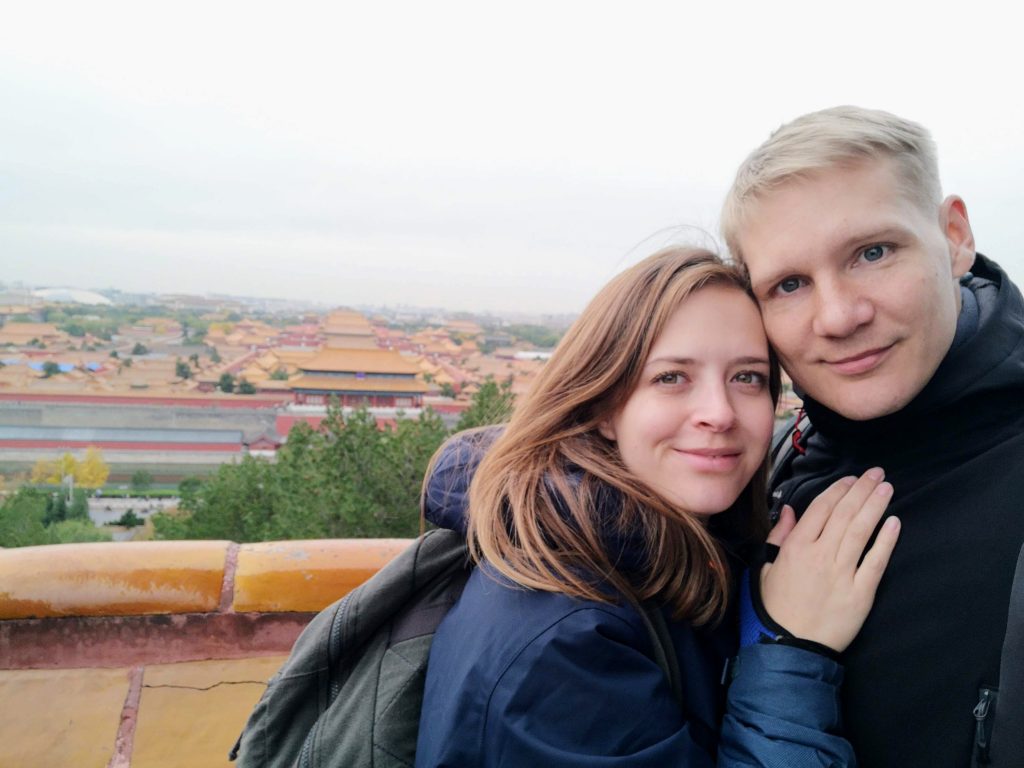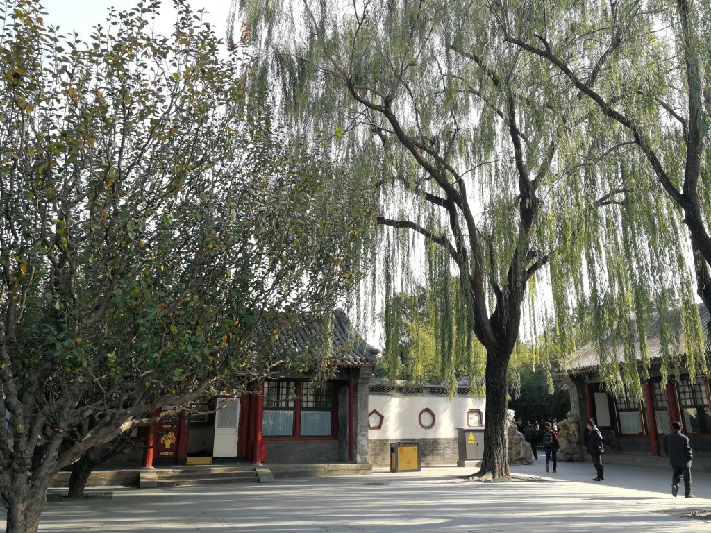 „Nach“ der verbotenen Stadt (man wandert von Süden nach Norden durch) bietet der Jingshan-Park eine wundervolle Aussicht über Beijing. Für mich einer der schönsten Orte. Hier wird einem das Ausmaß dieser riesigen Stadt klar. Man steht in der Mitte, etwas erhoben. Um einen herum alles flacher, mehrere Kilometer. Dann beginnen die Wolkenkratzer. So weit man gucken kann und in alle Richtungen. Chinas Großstädte sind geprägt von unzähligen, riesigen Betonklötzen. Kaum vorstellbar und vergleichbar mit europäischen oder deutschen Standards. Wir hatten Glück und im Hintergrund sind an diesem Tag sogar (trotz Smog) die Berge sichtbar.