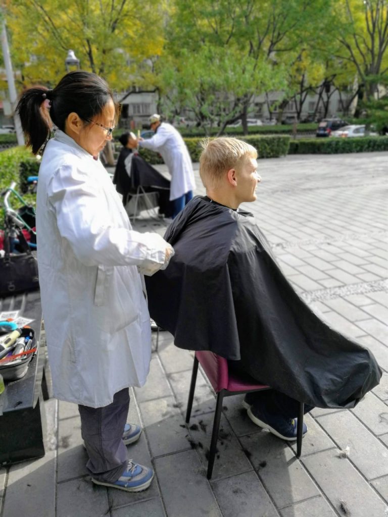 Und dann ging es doch nicht anders. Mit meinem Lieblingsfrisör in Bonn (www.sitstill.de, uneingeschränkt empfehlenswert!) hatte ich noch besprochen, die Haare einfach mal wachsen zu lassen. Aber dann habe ich mich doch zu unwohl gefühlt. Morgens auf dem Weg durch den Park steht ein Stuhl. Daneben eine Chinesin mit weißem Kittel. Und Schere. Alles klar, los geht’s.