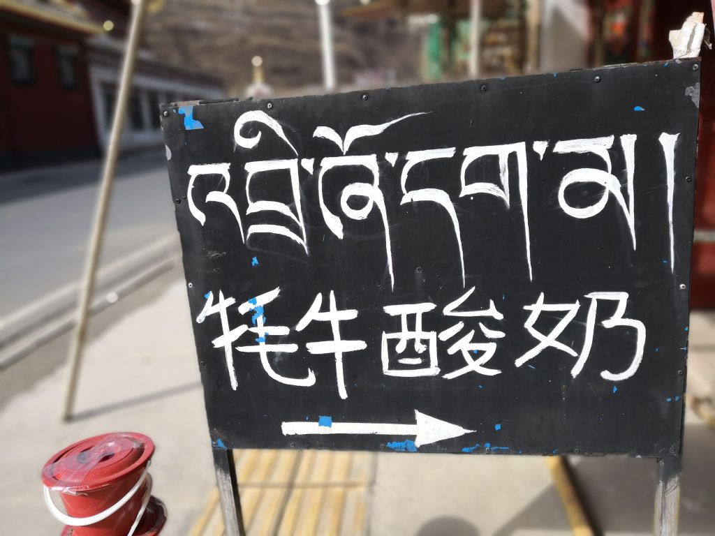 In Kangding ändern sich auch die Schriftzeichen. Zwischen chinesischen Symbolen tauchen nun immer mal wieder neue Zeichen auf. Tibetische Sprache.