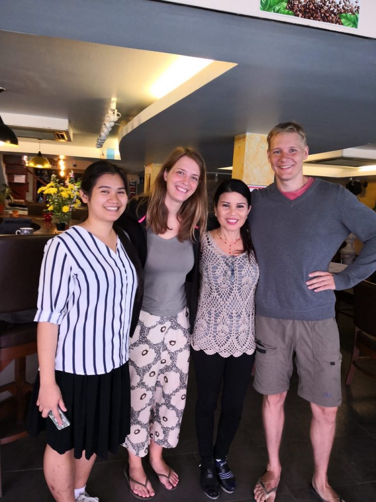 Die Stadt ist nicht riesig, aber doch eher größer. Für die Verhältnisse, die wir zuvor in Laos gewohnt waren, ist es hier auf jeden Fall wie in einer Großstadtmetropole;-) Es gibt moderne Cafés (mit „modernen“ Preisen 🙁 ), viel Zement und große Häuser. In der Nähe vom Busbahnhof finden wir eine kleine Pension, betrieben von zwei sehr netten Thai-Damen.
