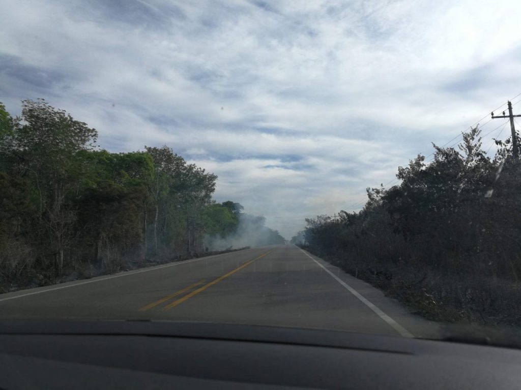 Wir haben aber ein anderes Ziel: Wir wollen am nächsten Tag die Hauptsehenswürdigkeit von Yucatan besuchen: Chichen Itza. Da sich die Strecke dorthin ziemlich zieht, machen wir uns also auf den Weg und fahren die nächsten Stunden recht monoton eine Strecke Richtung Westen ab. Es ist relativ ereignisarm. Das einzig Besondere, dass uns hier auffällt sind immer mal wieder Waldbrände. Rauchschwaden ziehen über die Straße und oft kann man auch das eigentliche Feuer sehen. Abends, im Hotel, werden wir im Fernsehen sehen, dass es mehrere Hunderte Brandherde in der Region gibt.