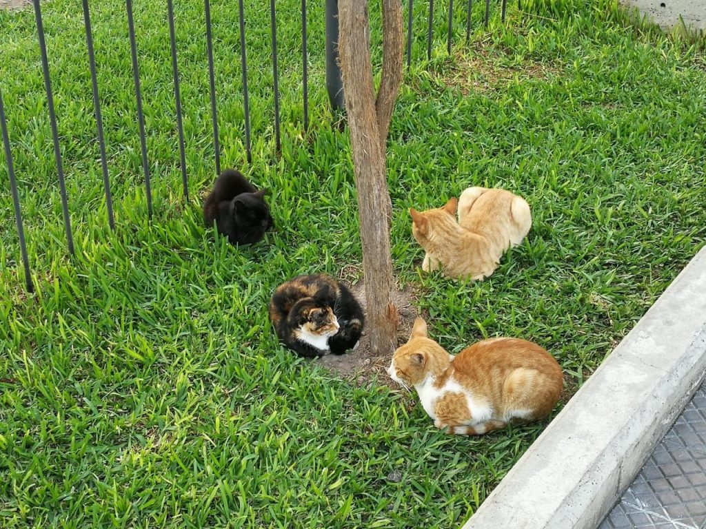 Wir schlendern noch ein wenig durch die Innenstadt und genießen die Atmosphäre. Die Menschen hier sind sehr nett und gerade Miraflores und Barranco sind sehr sicher. Da fühlen wir uns gerade richtig wohl. Auf dem Rückweg laufen wir noch am John F. Kennedy Park vorbei. Das besondere an diesem Park ist, dass sich hier unzählige Katzen niedergelassen haben. Hier ein Bild einer kleine Bande 😉