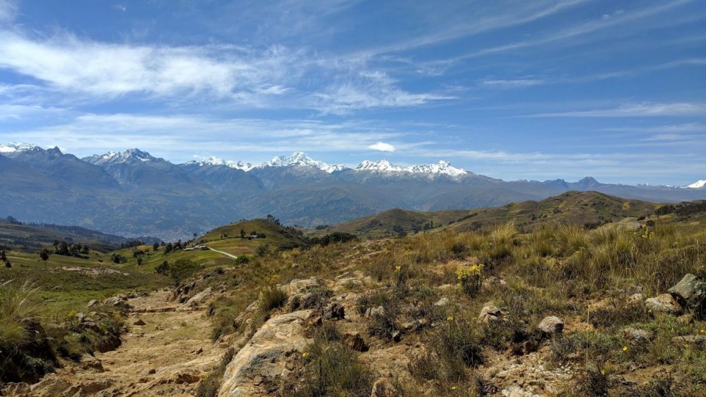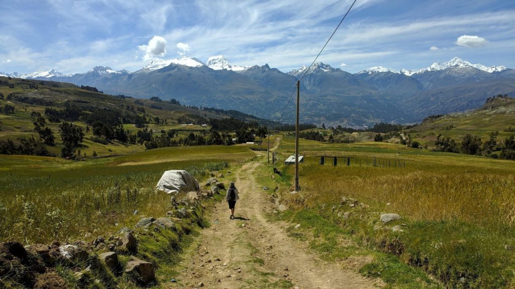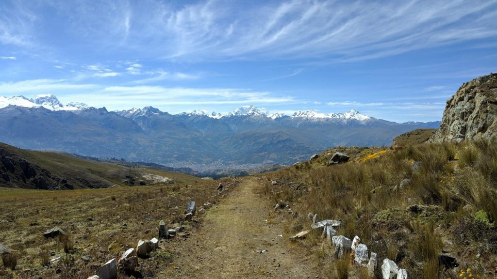 Hier stehen wir nun. Rechts die Straße, wo der Bus uns rausgelassen hat. Und links beginnt der Weg. Im Hintergrund die Cordillera Blanca. Das tolle: Wir sind nun im Westen der Stadt rausgefahren und blicken Richtung Osten auf Huaraz und die Cordillera Blanca. Die nächsten Stunden über liegen die schneebedeckten Gipfel vor uns. Links der Huarascan. Im Tal die Stadt Huaraz. Vollkommene Stille. Und wir genießen den Weg. Auch wenn die Bilder es – wie immer – nur in Teilen wiedergeben können, so kann man doch einen kleinen Einblick gewinnen.