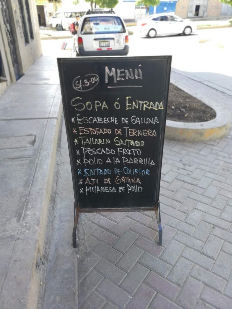 Lena ist unruhig. Das Atmen fällt etwas schwerer und sie hatte ja schon schlechte Erfahrung mit der Höhe, als wir in China in der tibetischen Region waren. Dort mussten wir aufgrund ihrer sehr starken Kopfschmerzen ( :-(( )wieder die Höhe verlassen. Wir haben für die nächsten Tage daher nichts geplant, sodass sich der Körper an die Höhe in Ruhe gewöhnen kann. Huaraz ist hierfür der perfekte Ort. Es gibt tolles Essen. Wirklich – ich könnte die ganze Zeit davon schwärmen. Peru ist kulinarisch DAS Highlight. Hier ein typisches Schild eines Restaurants: